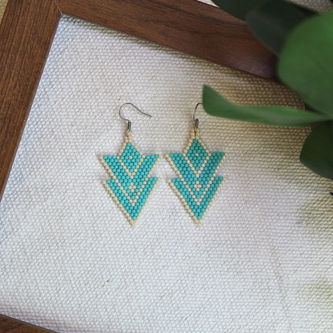 Geometrici, luminoși și foarte ușori. „Artemis” sunt țesuți manual din mărgele de sticlă în siluetă triunghiulară, cu dungi chevron în turcoaz intens și accente ivoire pe contur. Linia ascuțită alungește elegant gâtul, iar contrastul curat îi face perfecți de la zi la seară.