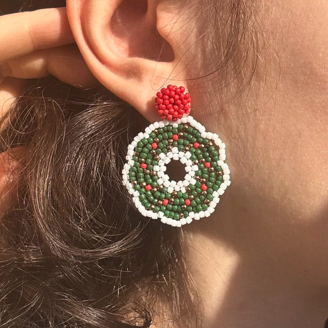 Festivi, luminoși și gata de sărbătoare, „Coronță” sunt cercei inspirați de coronitele de Crăciun, țesuți manual din mărgele de sticlă verde/alb cu stropi aurii și stud roșu ca o bobiță de vâsc. Silueta rotundă cu decupaj central creează un efect jucăuș pe lob, iar contrastul clasic roșu/verde îi face să strălucească în poze și la luminile bradului. Ușori și confortabili pentru toată ziua (și toată seara).