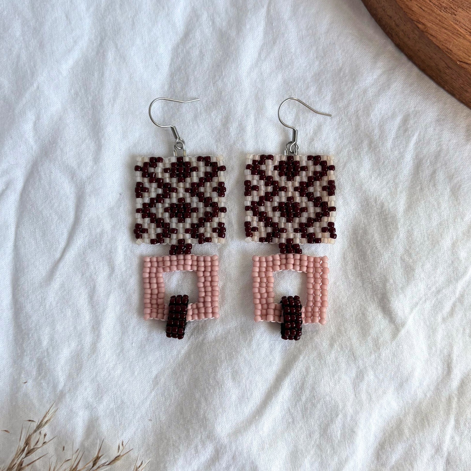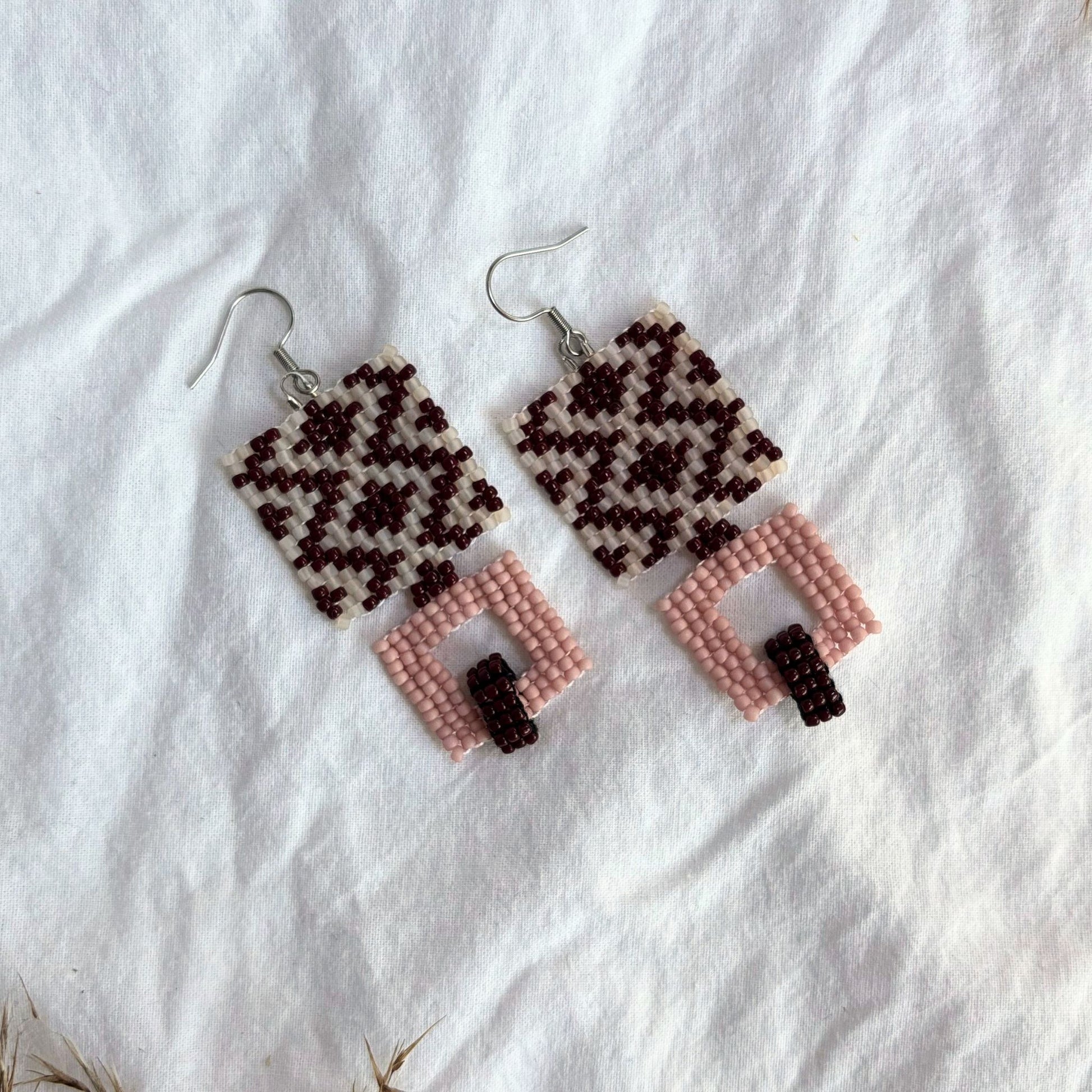 Geometrici, moderni și feminini. „Cubika” combină un modul pătrat țesut manual (pattern burgundy pe ivoire) cu un pătrat deschis roz pudră, unite printr-un mic accent vișiniu. Cerceii evocă o estetică echilibrată, ideală pentru femeile care iubesc formele curate, dar cu personalitate.