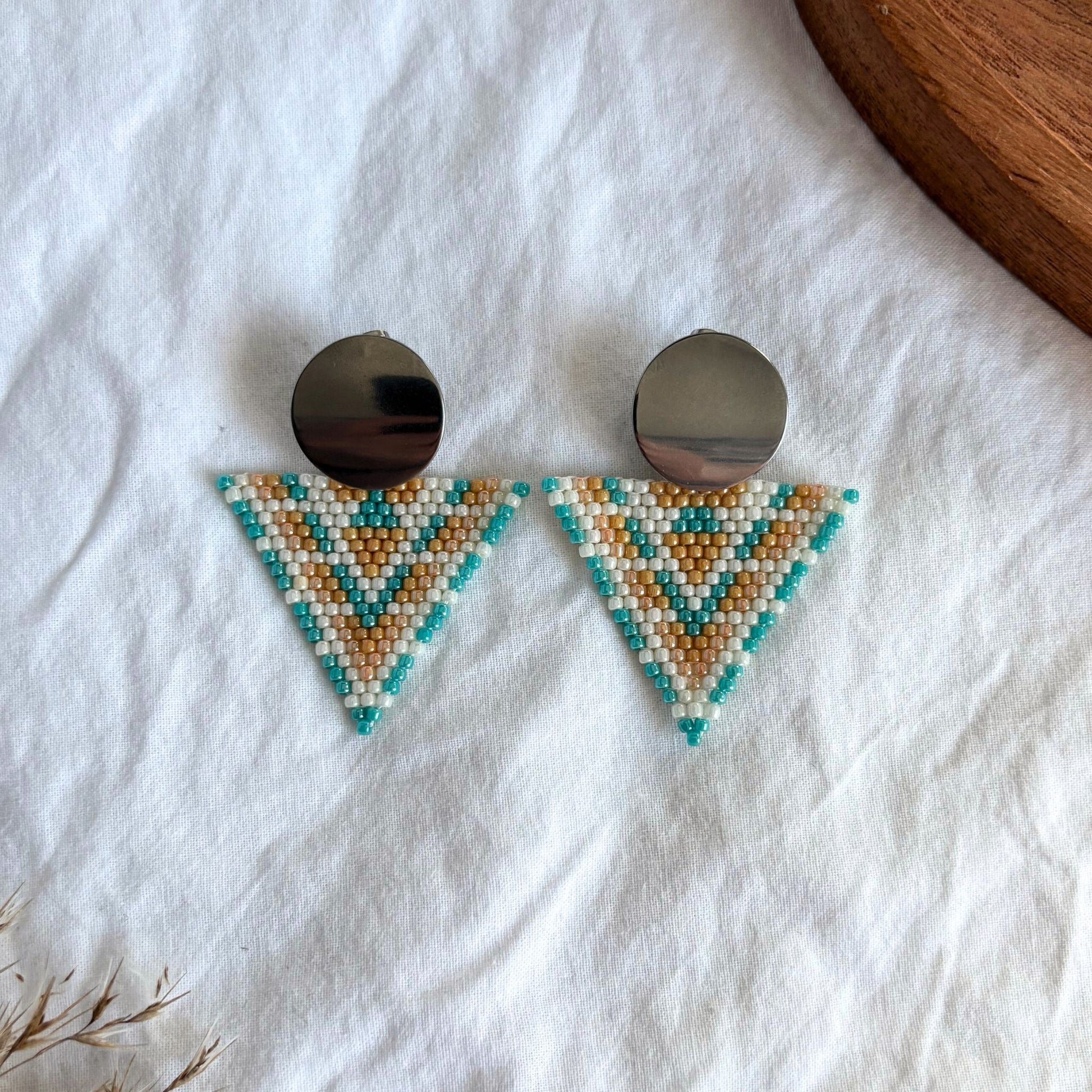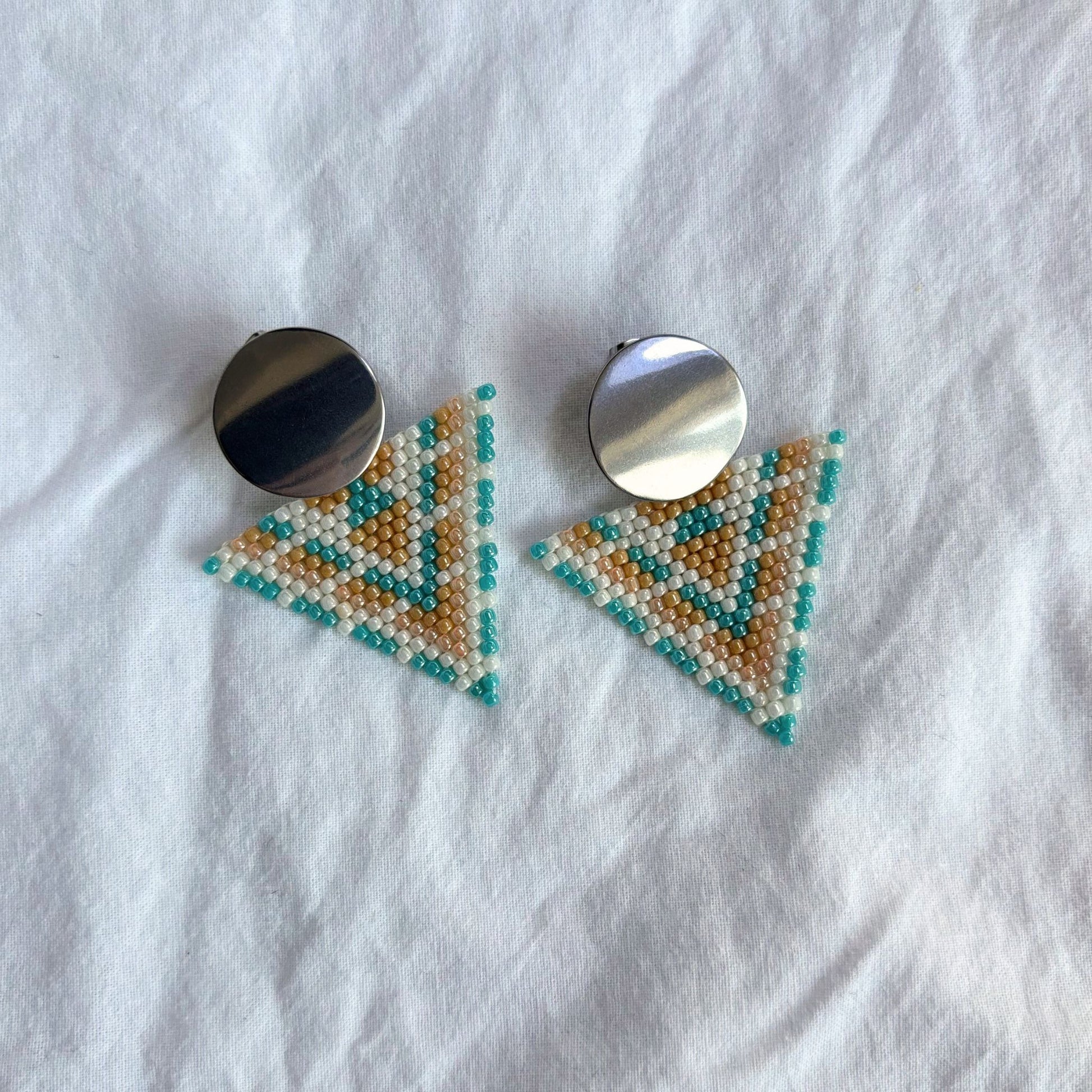 Geometrici și luminoși, acești cercei sunt țesuți manual din mărgele de sticlă în dungi tip chevron. Triunghiul în nuanțe de turcoaz, nisip și alb este prins de o bază rotundă metalică, lucioasă, care oferă un contrast modern și curat. Sunt ușori, echilibrați și adaugă o notă fresh oricărei ținute.