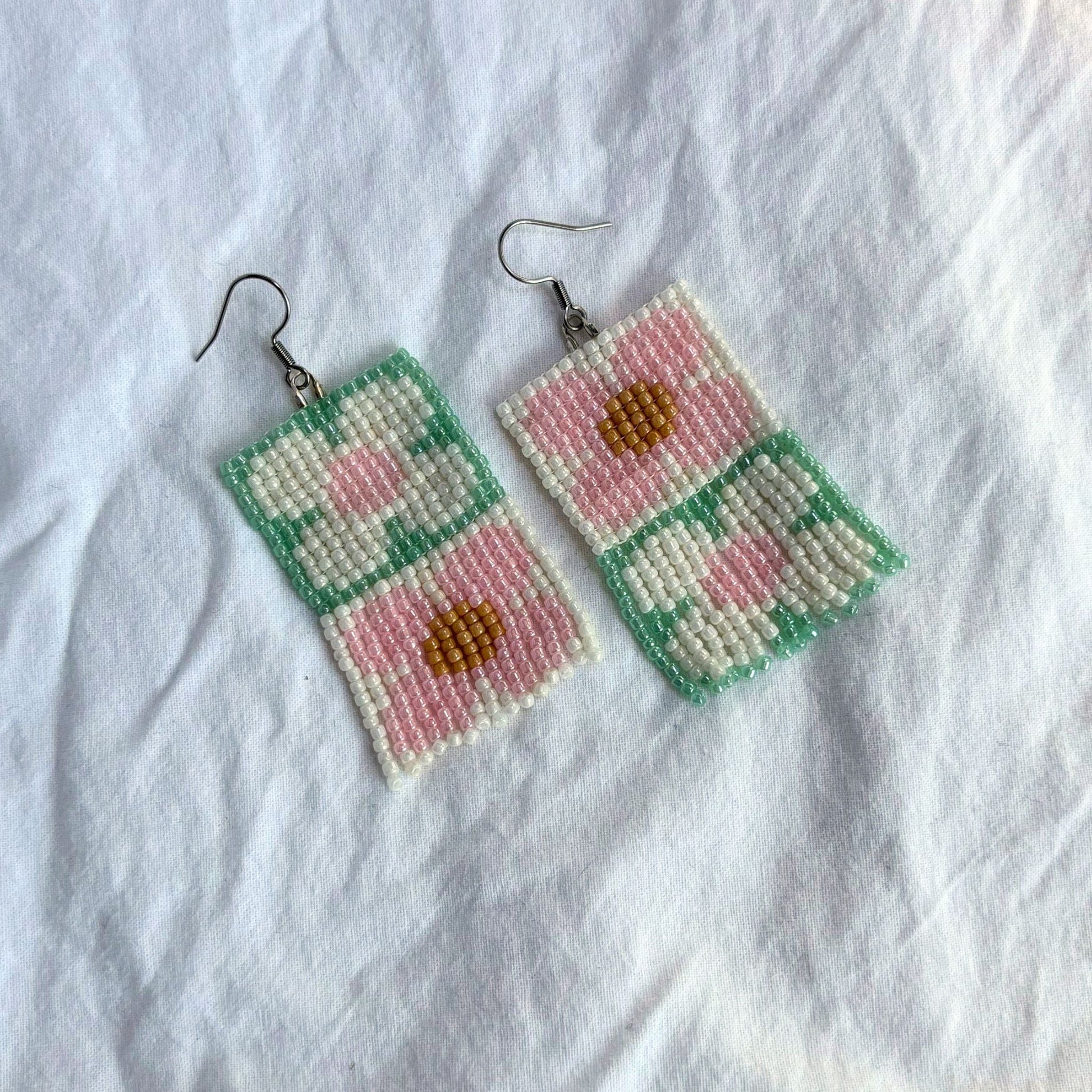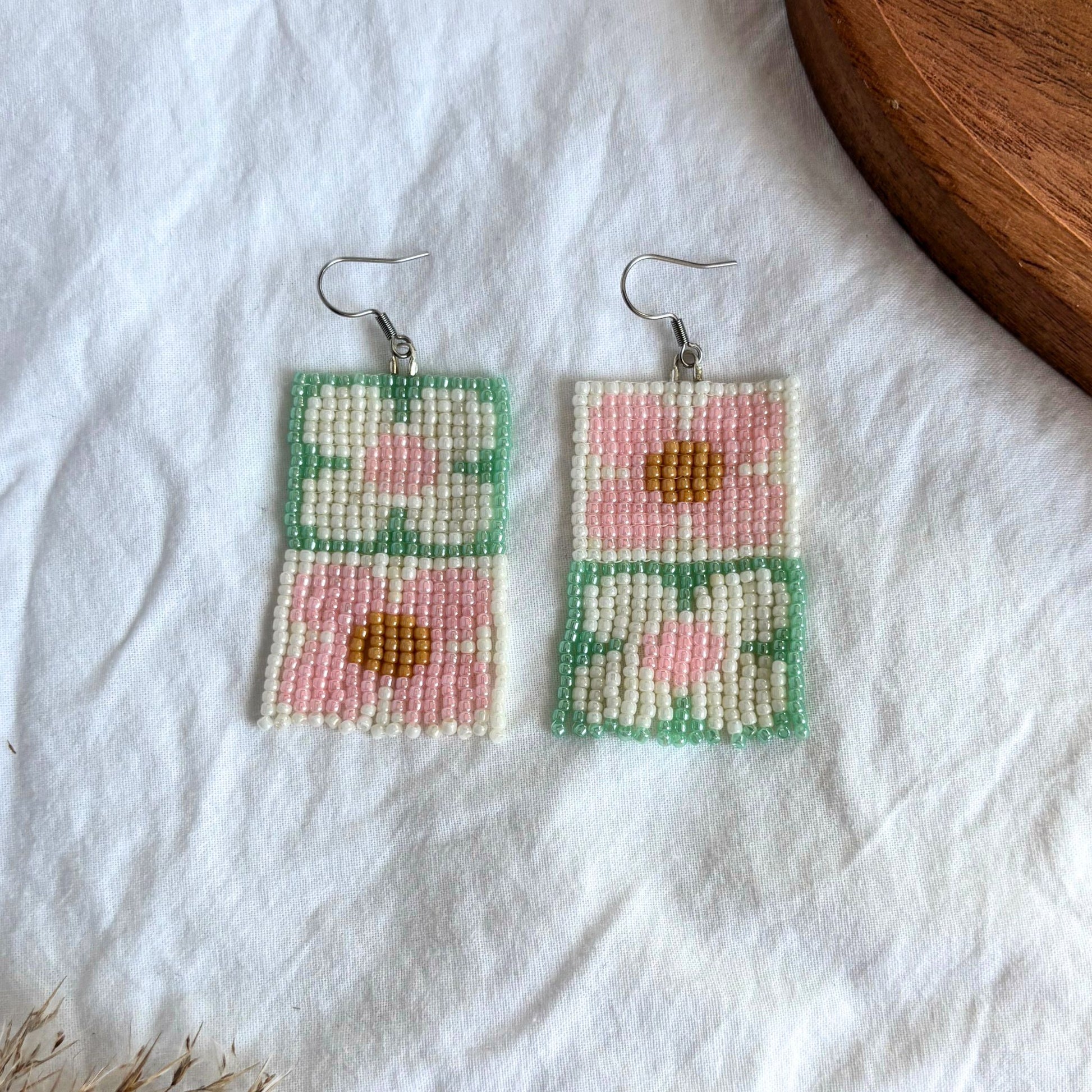 Acești cercei lungi combina o plăcuță geometrică țesută manual cu franjuri fluizi, fiecare cu un model floral stilizat din mărgele de sticlă. Motivele contrastante de „mozaic” – flori roz pal cu miez galben pe un fundal bej - ivory și cadre în verde mentă – aduc un aer jucăuș și retro. Tortițele sunt argintii și ușoare, iar dispunerea verticală a celor două elemente creează un efect elegant care alungește discret linia gâtului.