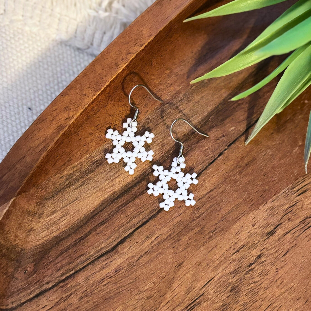 Delicați ca un fulg de nea și perfecti pentru sezonul festiv, acești cercei sunt lucrați manual din mărgele albe de sticlă, în formă de fulg, cu tortițe metalice argintii. Ușori, strălucitori discret și suficient de versatili ca să-i porți toată iarna: de la zile cozy la lumini de sărbătoare.