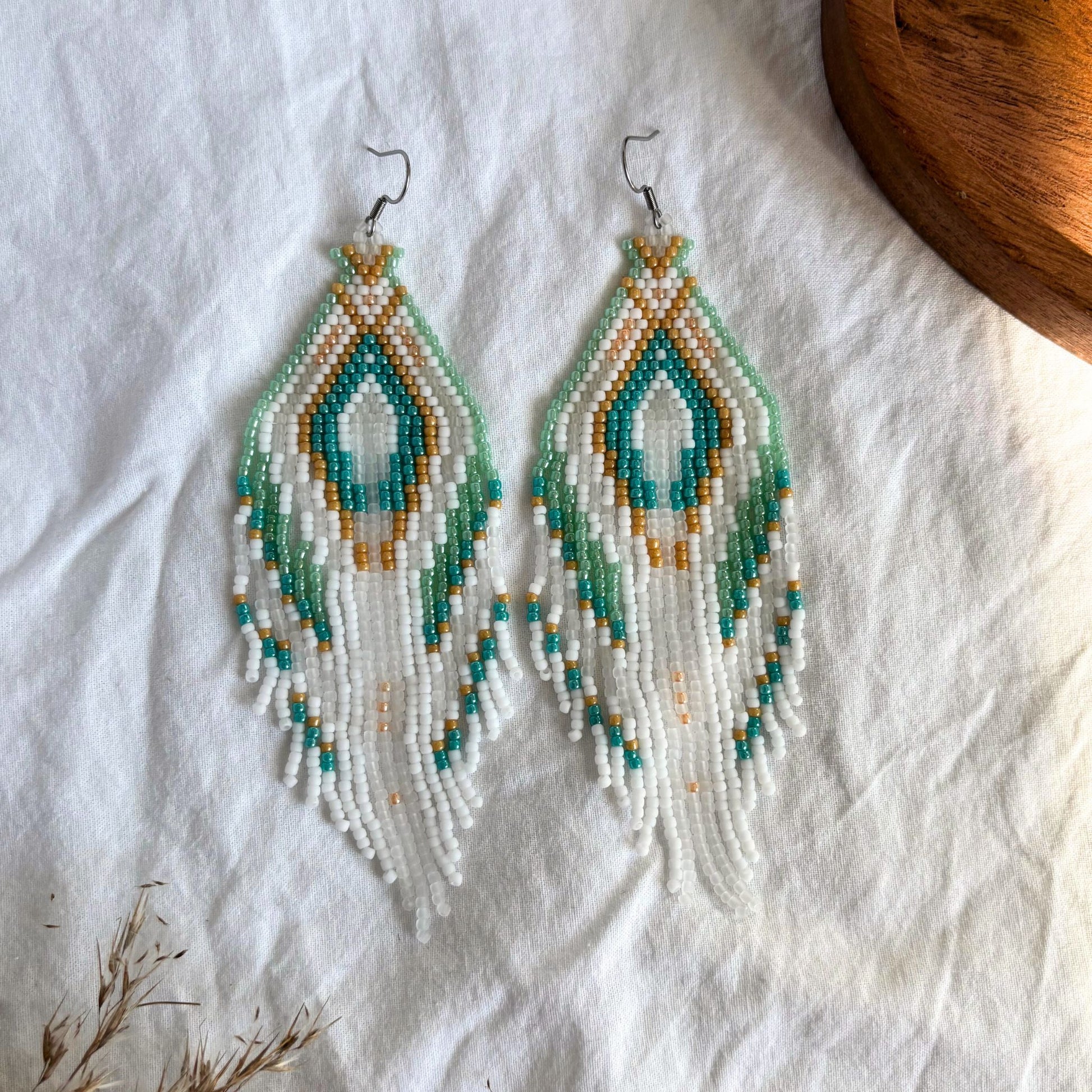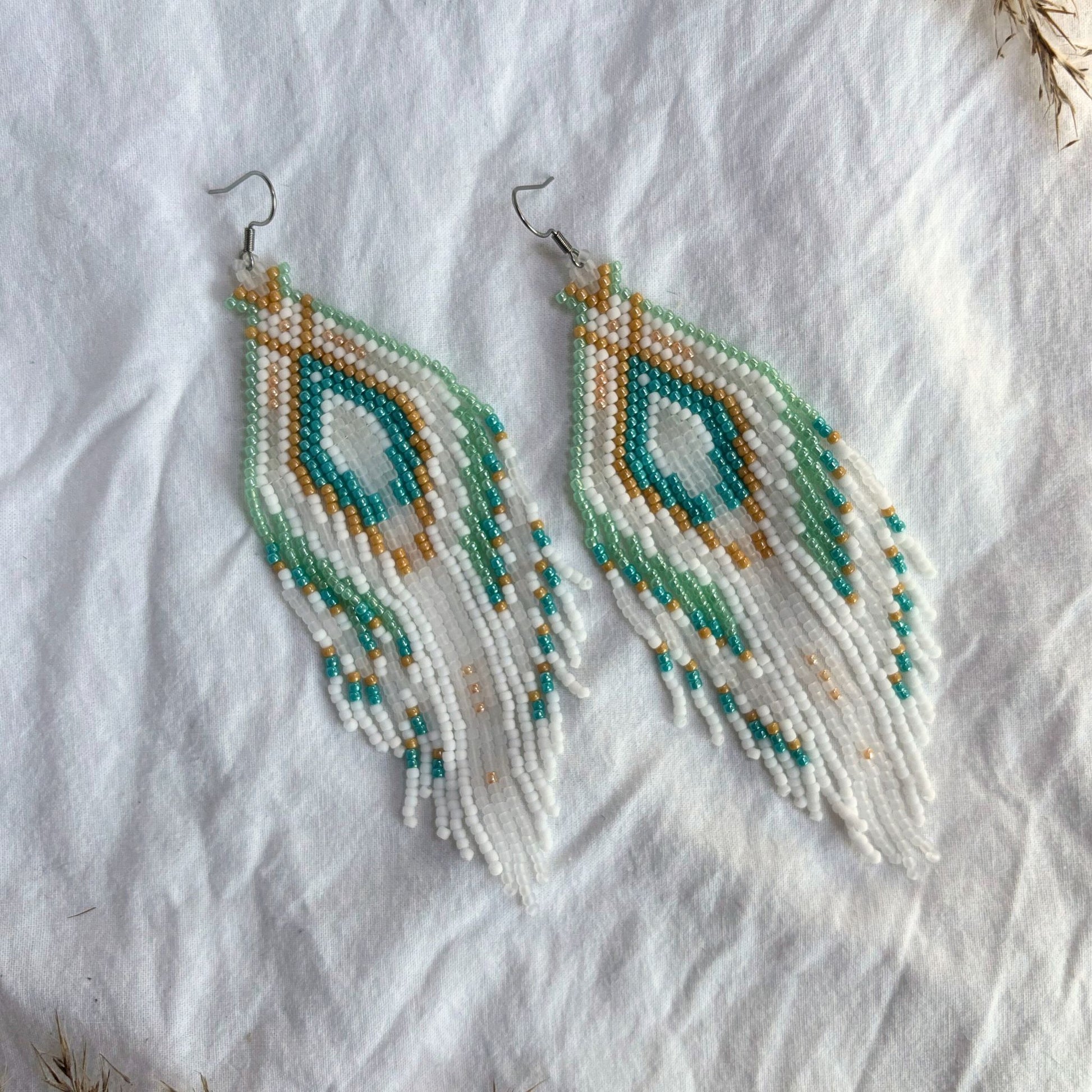 Eleganță aerată și multă mișcare. „Lira” sunt țesuți manual din mărgele de sticlă într-o siluetă alungită, inspirată de o pană/ frunză, cu franjuri care dansează la fiecare pas. Paleta luminoasă - alb lăptos, verde mentă, turcoaz și accente auriu-muștar - pune în valoare detaliile grafice din centru și conturul delicat.