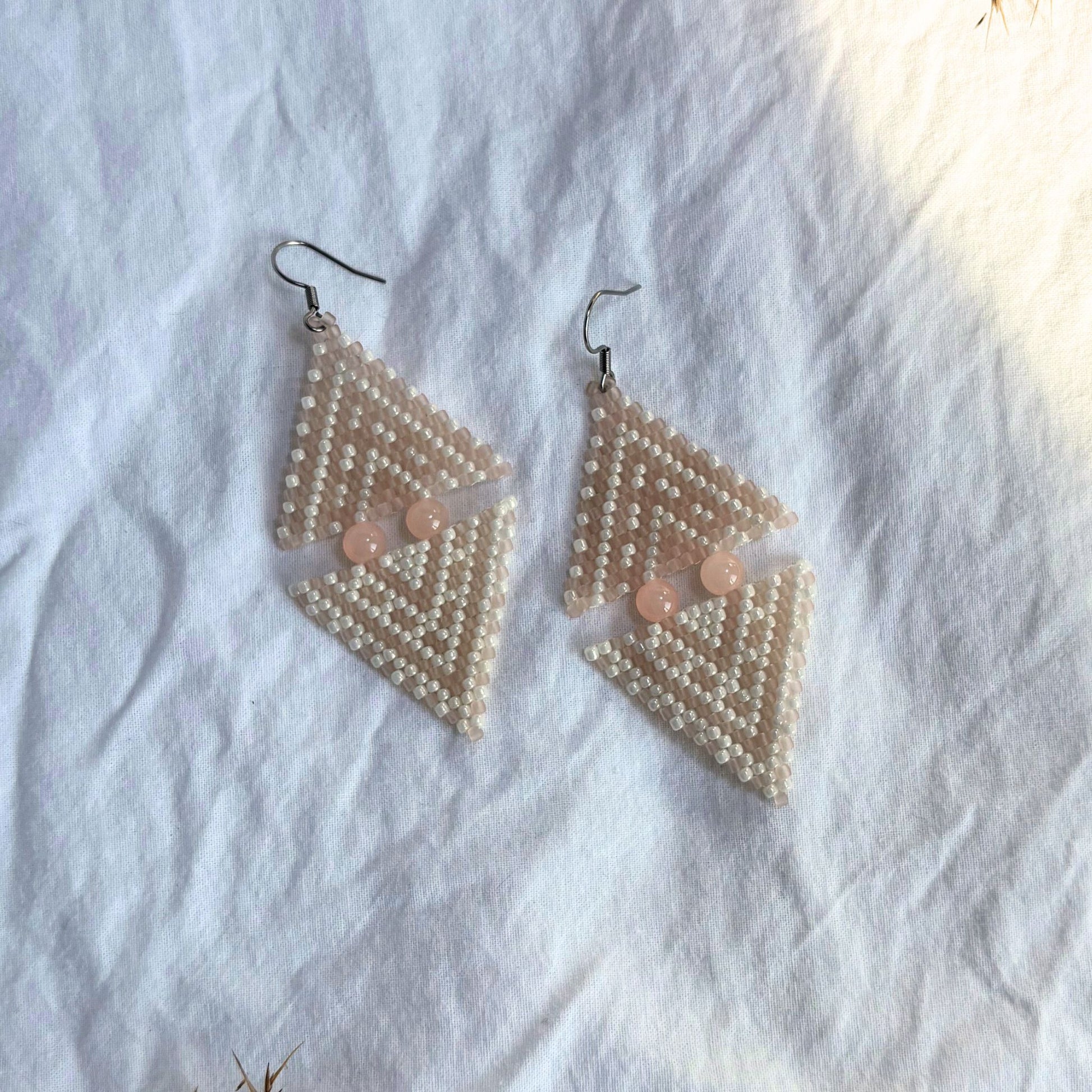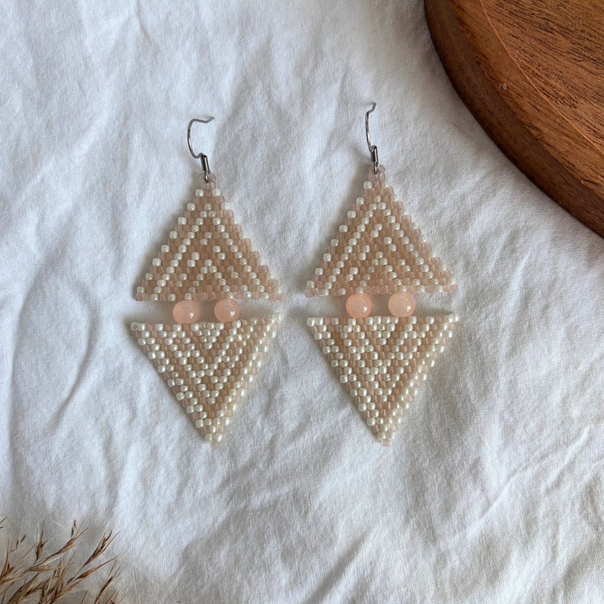 Delicați și versatili, acești cercei triunghiulari sunt țesuți manual, mărgea cu mărgea, într-un model simetric care prinde lumina frumos. Nuanțele calde de bej-ivory sunt puse în valoare de cele două mărgele rotunde „blush”, pentru un contrast fin, elegant. Ușori la purtare și foarte comozi, completează natural atât ținutele casual, cât și pe cele de seară.