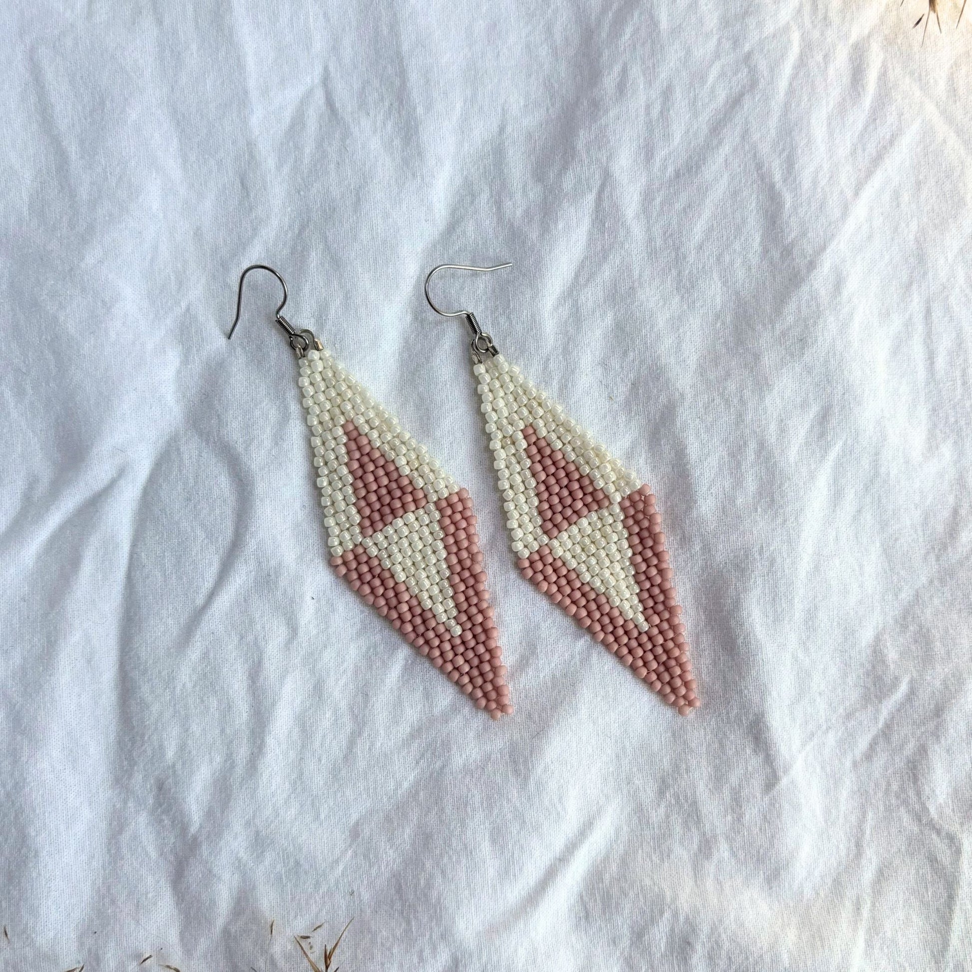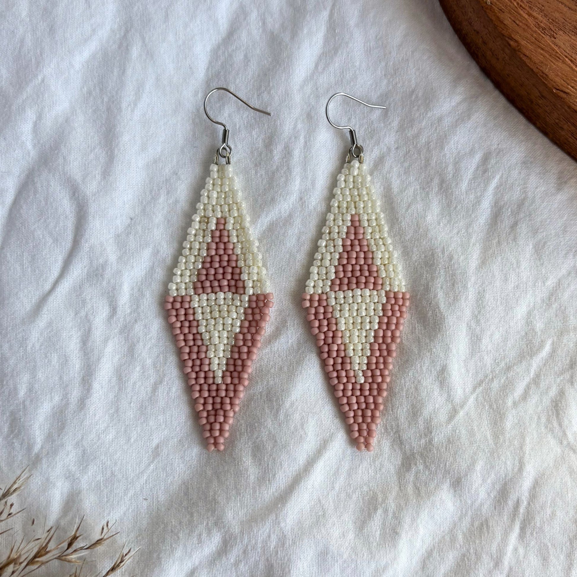 Inspirat de liniile clare ale geometriei și eleganța discretă a formelor romboidale, Rhoma reinterpretează clasicul romb într-o cheie delicată și modernă. Perlele albe și roz pudrat evocă feminitate, simetrie și echilibru interior. Designul alungit conferă suplețe și rafinament, completând orice ținută cu o atingere grafică și diafană.