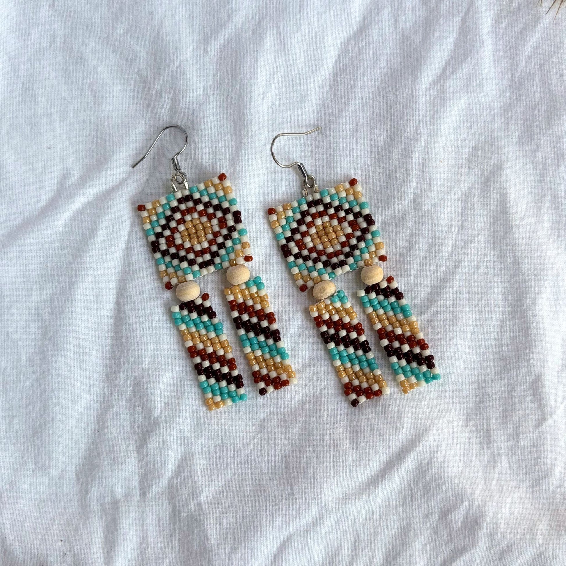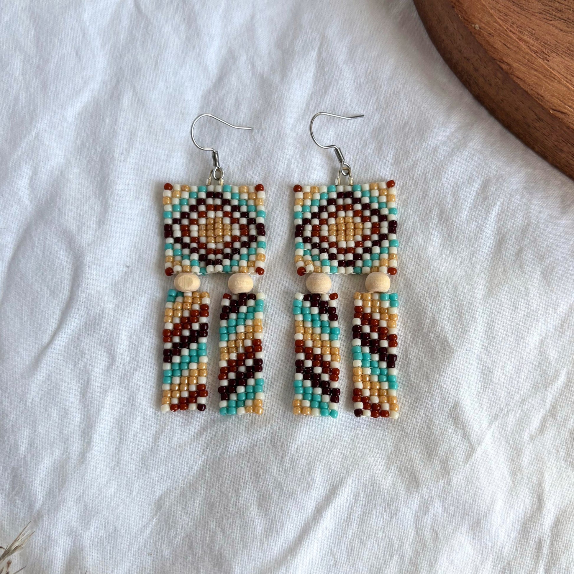 „Sienna” aduc vibrații calde și multă mișcare. Partea superioară este un pătrat țesut manual în motiv romboidal, iar dedesubt cad două benzi mobile din mărgele, prinse de o bilă din lemn natural. Paleta - turcoaz, miere, cărămiziu și ivoire - creează un contrast boho-modern care luminează orice ținută. Sunt ușori, echilibrați și dansează frumos la fiecare pas.